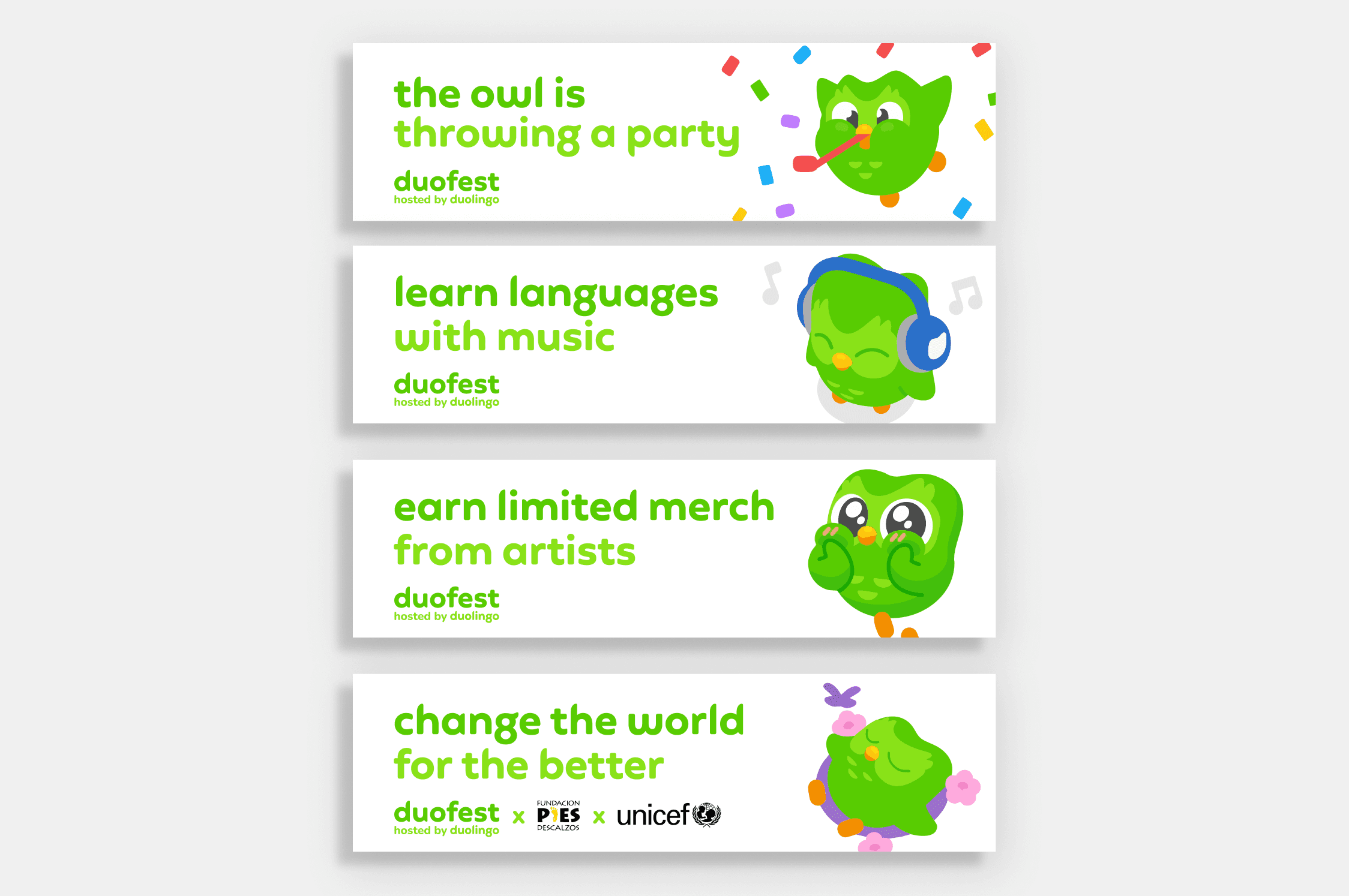 Additionally, we expanded the campaign's scope into the "real world" by creating a series of one-time pop-up experiences throughout multiple cities under the title Duofest. This initiative featured performances, partnerships with creators, and in-app real-world challenges, fostering a social and immersive community that promotes learning via Duolingo.